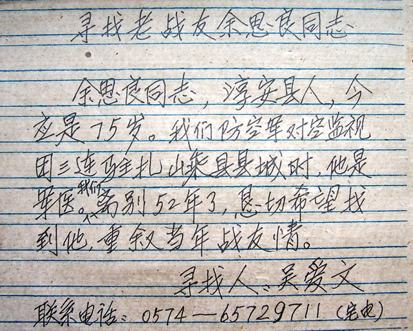 今日上午,收到象山中学吴爱文老师的来信,托我帮助寻找52年前的战友余思良。