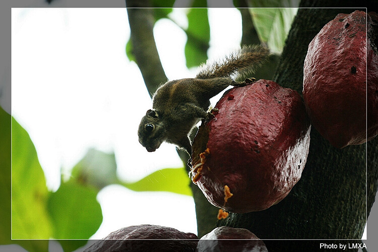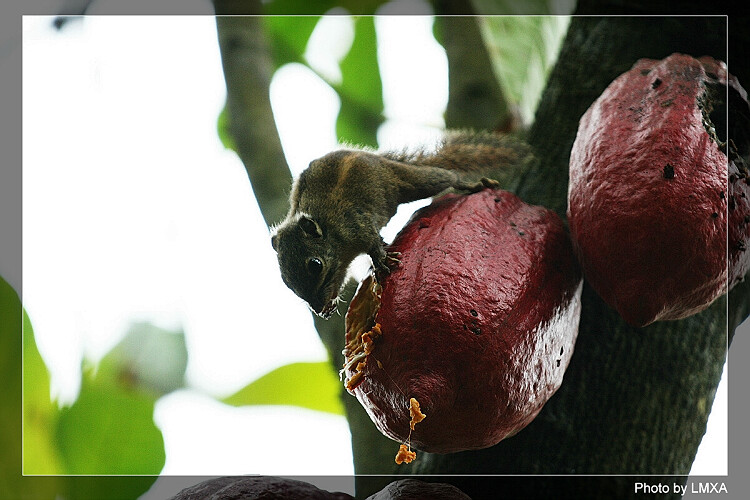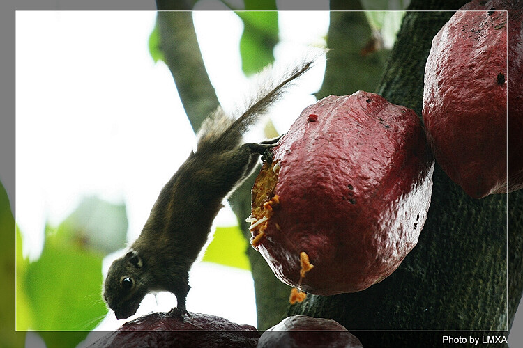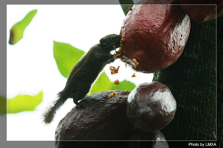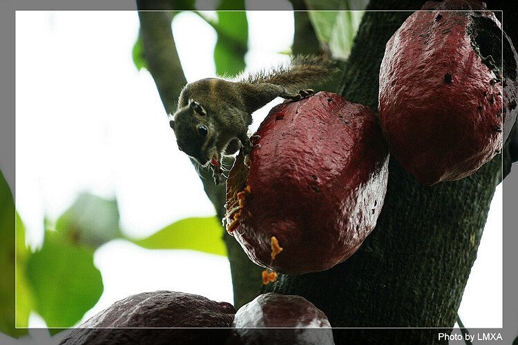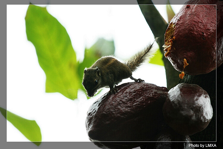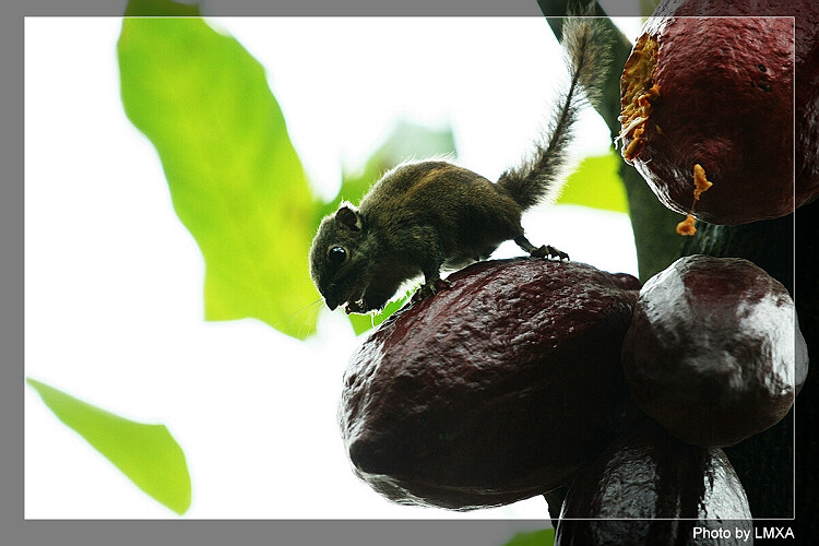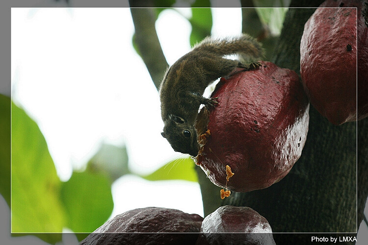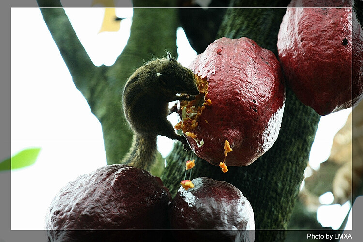 第一次见到小松鼠吃可可果,赶紧扫了几张。