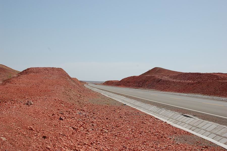 汽车沿准格儿盆地东部边缘北行,途中经过火烧山,大红大红的.路途中基本上是非沙漠非草原非戈壁的地形,还幸运地见到了普氏野马,据说只有10多头,全被我们见到了.