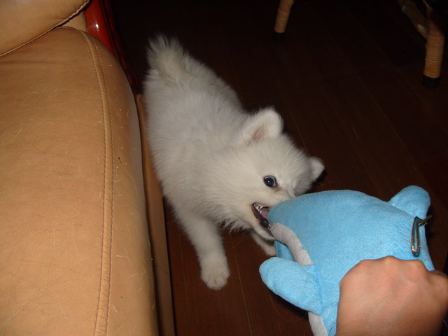 第一次见面,飘小狗自来熟,一进门抢了肥猪的玩具咬着,肥猪在远处监视