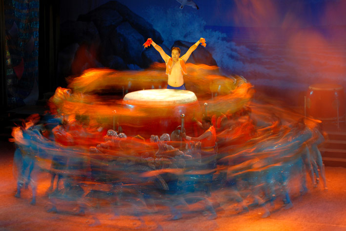 这是我在2006年9月6日,象山立县1300周年的纪念大会的文艺晚会上拍摄的,为较好地展现“渔鼓”气势,我在象山县委新闻办朋友的帮助下,要到了晚会会场楼上第一排的票,架好三角架,用长焦镜高视角抓拍到这一瞬间。另悉,“渔鼓”舞蹈获2006年浙江省“群星奖”广场舞蹈大赛金奖第一名,并将冲击第14届全国广场舞蹈大赛“群星奖”。
