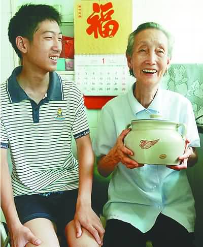 当年救过美国飞行员的赵小宝和她的孙子向记者展示1992年她访美时,美国政府送给她的纪念品———一件瓷罐