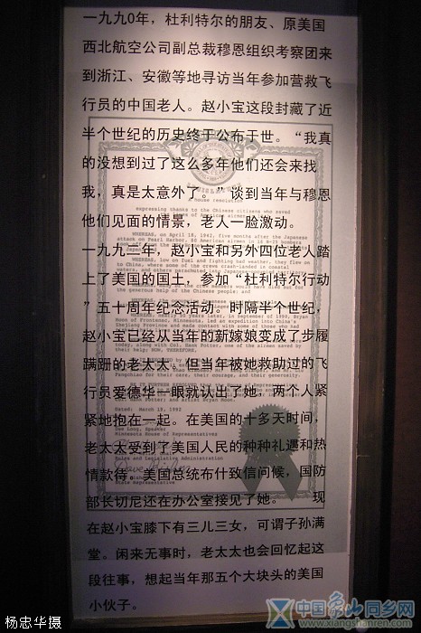 1992年3月13日,应杜利特尔轰炸机队协会的邀请,赵小宝和另4位救助美军飞行员的老人踏上了去美国的班机,参加“杜利特尔行动”50周年纪念活动。小宝拿出一本厚厚的影集,里面都是她和另4位老人在美国参加每一站纪念活动的照片,从这些照片里,我们看到当时美国人民的盛情接待;白宫草坪前、五角大楼切尼办公室、空军学院大礼堂,这些地方的留影也见证了美国政府对老人们的尊敬和谢意。在石浦老街的纪念馆里,我们还见到了老布什给老人的感谢信,信里说:我们永远不会忘记中国人民为正义事业做出的杰出贡献。