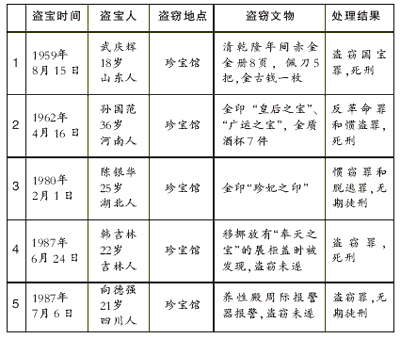 据《全国文物犯罪案例选编》记载,当天吉林人韩吉林切断报警装置,将放有奉天之印、皇后之宝等11件国宝的展柜挪开时被发现,逃离时被擒,后被判死刑。