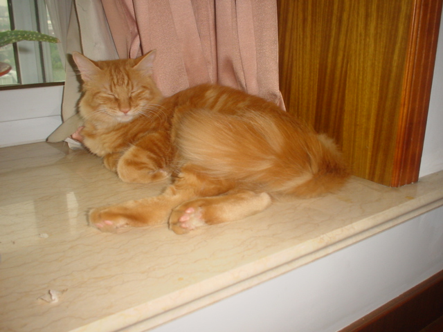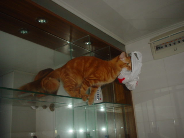 厨房的玻璃柜最上格放着一小袋小黄鱼干,是姆妈从家带来上海的,偶尔想吃的时候拿几条小鱼儿蒸蒸解解馋。放的老高是不想让猫偷吃了,因为是咸鱼,猫不能吃太咸的食物,对身体无益处。尽管放的高,但小鱼儿的香味儿还是一个劲地往猫鼻子里钻......于是,只要厨房门开着,就能见着一个黄影子以发火箭的速度冲进厨房.....从地上跳到冰箱再上玻璃柜顶格, 每次都是滑倒失败告终,呵呵,是因为俺家的玻璃柜不好搞定