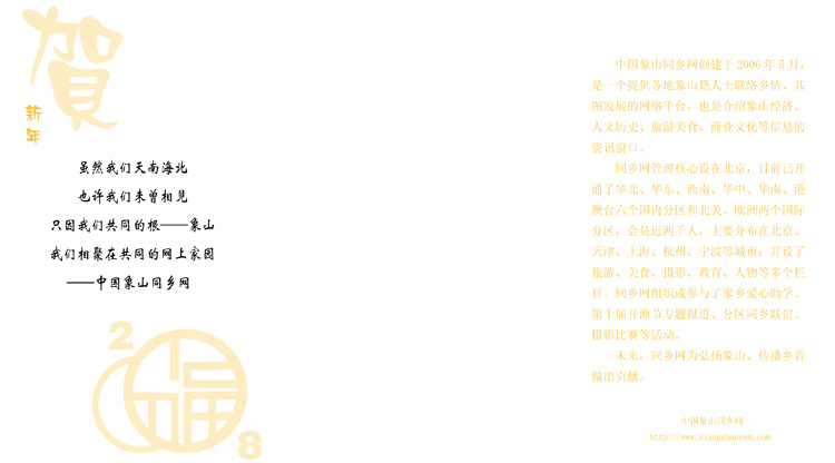 再过二十多天就迎来2008新年,2008是中国奥运年,是幸运吉祥的一年,中国象山同乡网特意制作了一些2008新年贺卡,送给在各地工作、学习、生活的同乡,数量有限,送完为止。