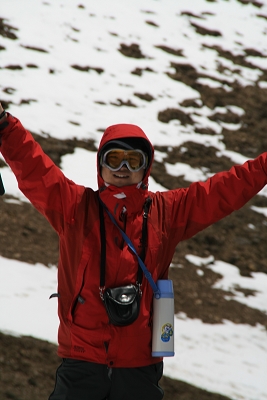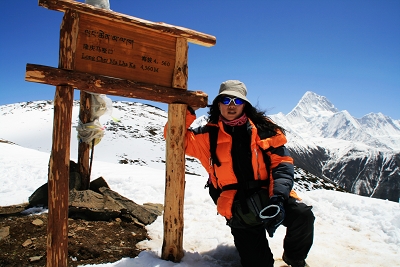 雪很深,走得很吃力.下午1点多所有的队员都通过4600米的垭口,向导说下去还有两个小时,我们很兴奋,这样的话我们就会比原来的时间提早好多.