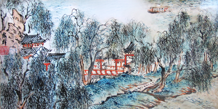 杨露群的作品继承了传统文人画林泉高致、无我之境的笔墨意趣,画面明净淡雅、秀润清逸,一笔一墨,都透露着一股雅正的古意,观其画作,不禁会使人生发强烈的思古之幽情。从形式上看,她的作品以浅绛山水为主,传统的浅绛山水画是指以赭色为主调的山水画,其特点是素雅青淡,明快透澈。用浅绛设色的大家不乏其人。如王维、董源、巨然、李成、郭熙、黄公望、倪云林等等。浅绛介于青绿和水墨之间,我认为是比较适合于女性的“平和”的画种,相对于青绿的浓墨重彩和水墨的孤高冷峻,浅绛更有一股自然清新的平和之风,在审美情趣上使人感到更亲切,更愉悦。