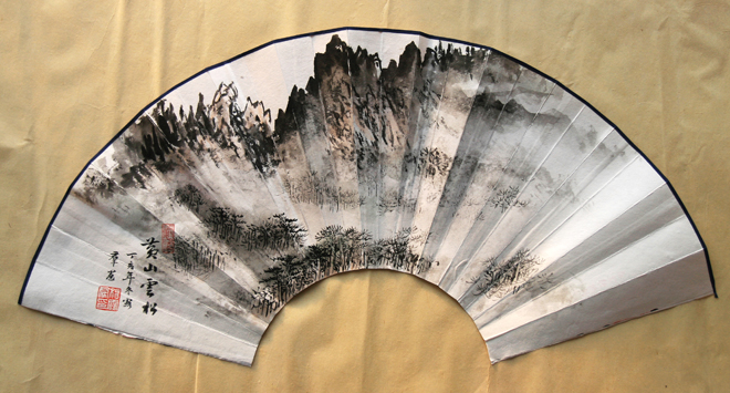 杨露群老师虽然在摄影上还是个新兵,这支沉甸甸的“小白”端在她手里还有些发抖(毕竟“小白”比毛笔重得多了)。但我没有料到她在国画创作上已经整整坚持7年了,她说:“我的老师告诉我,画画的要做到板凳坐得10年冷,我只有7年。”她比较喜欢扇面山水的创作,计划创作一个大系列500幅的扇面作品,现在已经画了200多幅了。按杨老师的成绩,她在象山画界应该可以显山露水了,但她总认为自己的作品不到火候,这种低调的作风正是她坚持传统的另一面------中国君子文化谦谦之风的体现。可见,在当下这个浮躁的时代,能够静下心来搞艺术的确实是难能可贵。