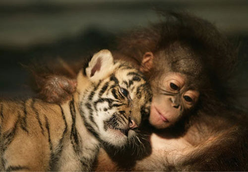 图四:2007年2月26日,照片上一只出生26天就被妈妈抛弃的小苏门答腊虎依偎在一只 5个月大的猩猩身上,后者也被猩猩妈妈抛弃了。
