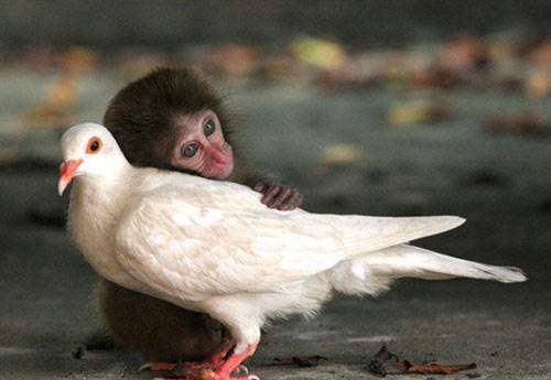 图五:在广东省伶仃岛,一只小短尾猿出生后不久就被母猿抛弃,幼小的短尾猿把头轻轻地靠在鸽子身上,岛上保护站的工作人员及时发现并喂养小猴,而这只鸽子则一直与其相依相伴。