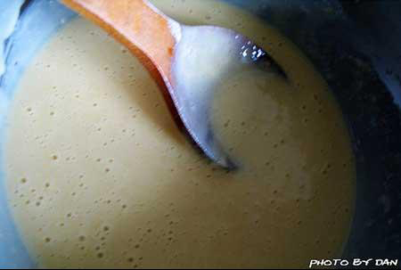 4.汤勺舀入一勺,一定是小火哦...大概看到有很多气泡后,翻一面