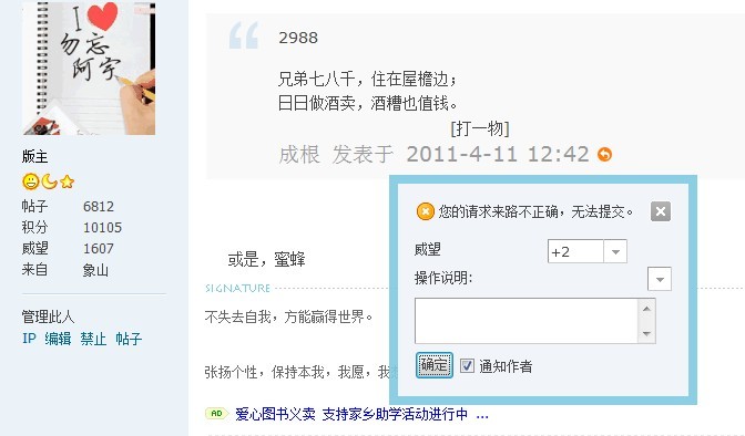 哈哈,可能戒慧的答案来路不明,所以加不了分 习惯~~有你 发表于 2011-4-11 11:43