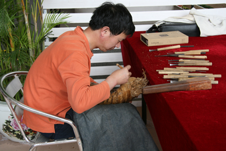 象山三位竹根雕大师在县委宣传部和县文联的组织下,携带作品参加了此次展览。象山展区面积大约100平方米,展出作品30余件,这些作品都出自张德和、郑宝根、周秉益三位大师之手,属于竹根雕中的精品。