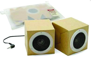 日本MUJI公司研制的这种新型纸板音箱,由一些电子元件构成。携带时可以将其展开,变成一个纸板放入塑料袋中,使用时再将它折叠起来即可。