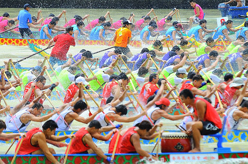 龍舟比賽劃槳途中的精彩瞬間