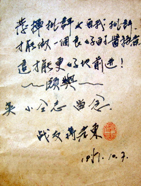 真所谓“有心栽花花不发、无心插柳柳成荫”。这个信息却被其他战友发现。今年5月18日,蔡守惠(图3中)、蒋孝东(左2)等约吴爱文聚会。吴爱文带着他们的临别赠言(图4、图5)前往,并合影留念;还有两位志愿军战士名叫竺佩坤(右2)、邹祖平(右1)。