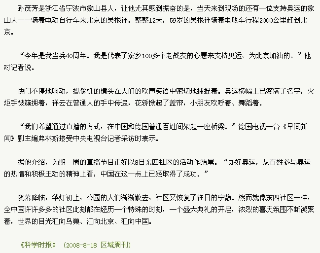 原帖由 skyhood 于 2008-8-7 12:36 发表 “象山吴根祥单骑来京迎奥运暨王增才执裁奥运”欢迎宴会 “象山吴根祥单骑来京迎奥运暨王增才执裁奥运”欢迎宴会将于今晚(7日)在宁波宾馆举行,到时将邀请特殊嘉宾、北京奥运火炬手孙茂芳先生出席,来京 ...