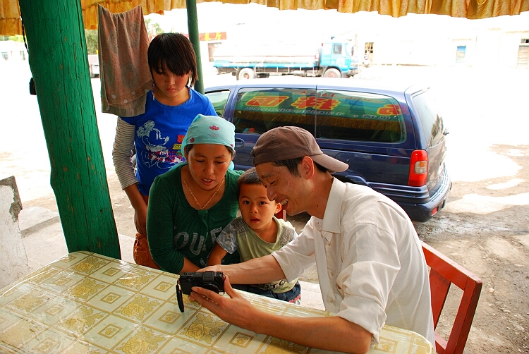 回民餐厅还是比较有特色的,裤子就拿出相机来拍餐厅的情形。这边的人估计很少看见这么现代的东西,都对裤子手里的东西很好奇。裤子很热情地给她们介绍一路上的所见所闻,还开了电脑给她们看自己拍的照片,末了,把店里拍到的人和物刻了一张光盘送给了店里的老板娘。 |