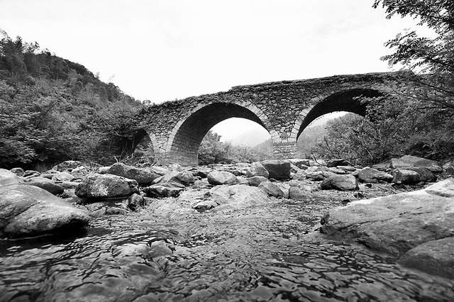初冬季节,在它即将被淹没之前,我又来到了这里。在寂静无人的山谷里,面对着欧阳桥,一切都在寂寞中孕育。天以辽远的蓝色贮满云朵,大地把浓重的一笔泼墨在故乡的土地上。我的故乡以一座桥的厚重和儒雅来迎接我。没有耕耘,没有喧哗,甚至没有人迹,只有群山和我固守静默。而缘溪那一浅银亮的河水,仿佛已从欧阳桥的沉默中流淌出一缕思绪。它在静谧中,在草和苔藓之间缓缓移动,在前世今生间缓缓流逝,一路上唯有蓝天白云与它同行。一代又一代的人过去了,欧阳桥在见证了故乡百年的沧桑后,依然是那样气定神闲,远离尘嚣,自由自在地在山林的云雾弥漫中小憩,一年年听缘溪起伏跌宕的吟唱,看满山苍翠秀丽的野景,静卧山涧,默默安守一份阅尽世态的安逸和坦然。这种沧桑总能勾起游子内心的惊慌和触动,于是忍不住回首当年。当年造桥是何等艰辛,先人造桥的决心又是何等坚决。大桥落成之时,又曾带给后人多少的方便和生机,一座桥就是一卷无言的史册。