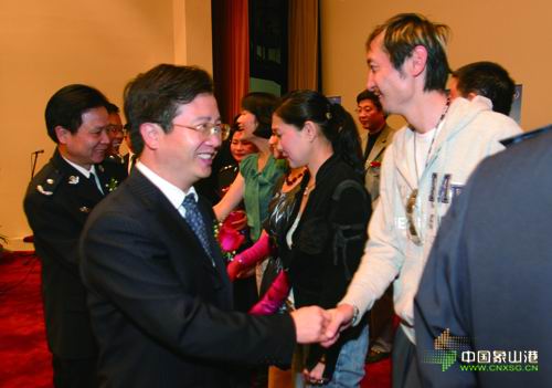 县委书记周江勇等在首映式上向主要演职人员握手致谢。