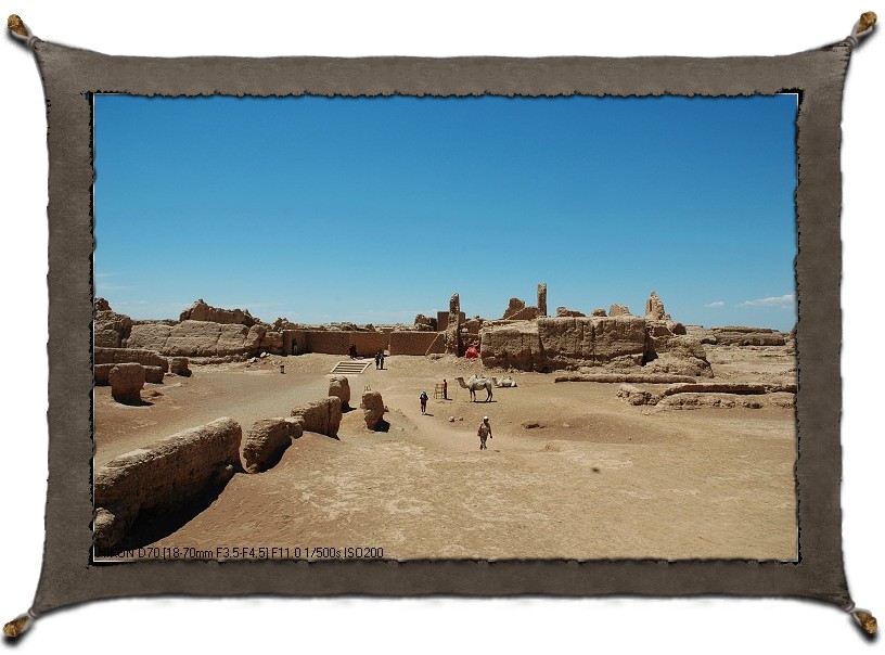 俯瞰楼兰古城,城中东北角有一座烽燧,虽然经过历代不同时期的补修,但依然从它身上可以看出最早汉代建筑的风格。 烽燧的西南是“三间房”遗址。这座100平方米的房屋,建筑在一块高台上,三间房正中的一间要比东西两间显得宽大。本世纪初,斯文.赫定曾在东面一间房内发掘出大量的文书简。从三间房西厢房残存的大木框架推测,这里昔日曾是城中屯田官署所在地。继续向西,是一处大宅院。院内,南北各有三间横向排列的房屋。在古城,这座院落建筑也是比较排场的。相形之下,大宅院南面的房舍多数是单间,矮小、散杂而破败不堪。如果根据出土文书推测三间房毗邻的框架结构房屋是楼兰古城的官署遗迹。