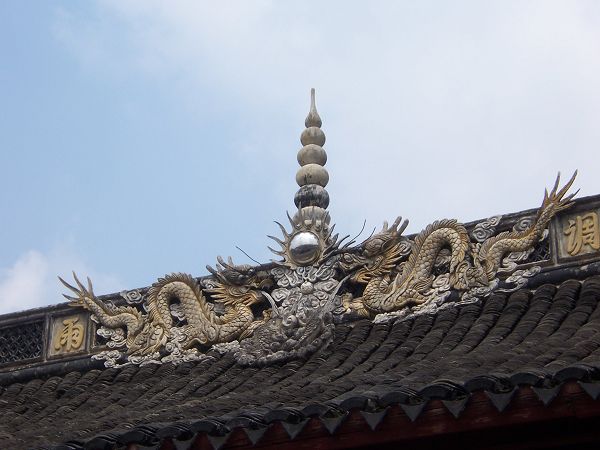 与其它庙院一样,在大殿屋脊上有“风调雨顺”四字、还有双鱼和双龙抢珠的雕塑(图一)。佛教是“善教”,墙上张贴着劝人为善的《三世因果》(图二)。
