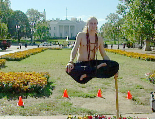 在美国白宫前的拉斐特公园,聚集大量游客和当地居民。他们一边目不转睛地紧盯着“悬浮”在空中的一名男子,一边不断按下手中相机的快门,唯恐错过任何一个精彩片断。原来是荷兰著名魔术师拉玛纳(Ramana)正在现场表演他的拿手绝活——“空中悬浮”。