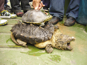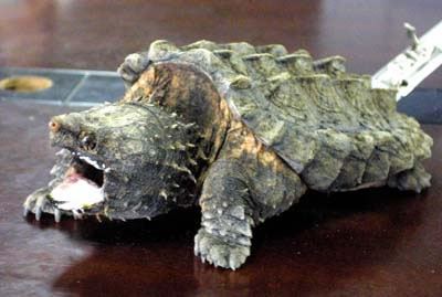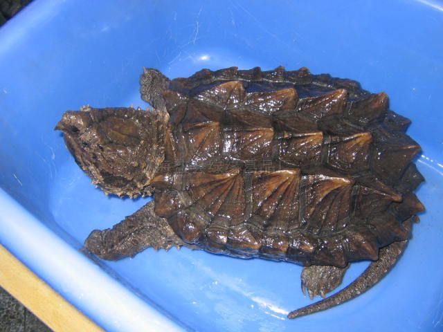 有关水产专家告诉记者,从其模样初步判断,该龟为“鹰嘴龟”(学名平胸龟),主要分布在我国南方等地,是我国淡水龟中最特殊的一种,头不能缩入壳内,其性情凶猛,属我国二类保护物种。因过度捕捞,该物种一度濒临灭绝。该专家说,该只“鹰嘴龟”体形如此庞大,估计“年纪”至少有500岁。 |