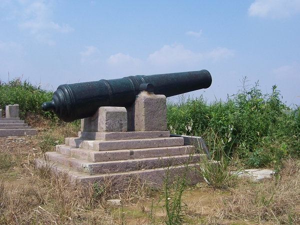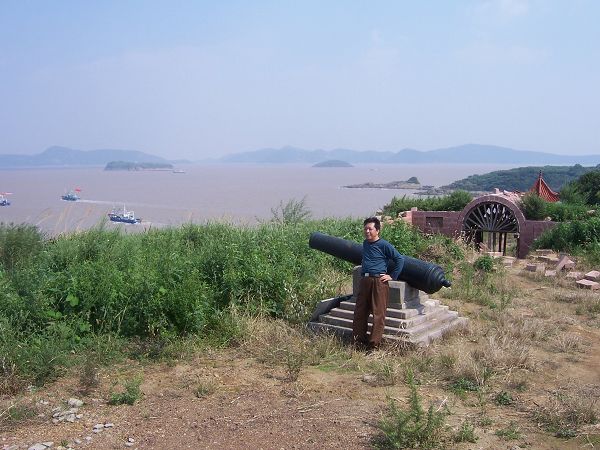 在门头山巅,有明初抗倭时建筑的“浙东第一烽堠”;清代修为炮台,置有铜大炮(图一)。此地该留个影(图二)!炮台山下的城隍庙前,有《明抗倭海房遗址》纪念碑。弟弟,你也留个影(图三)!