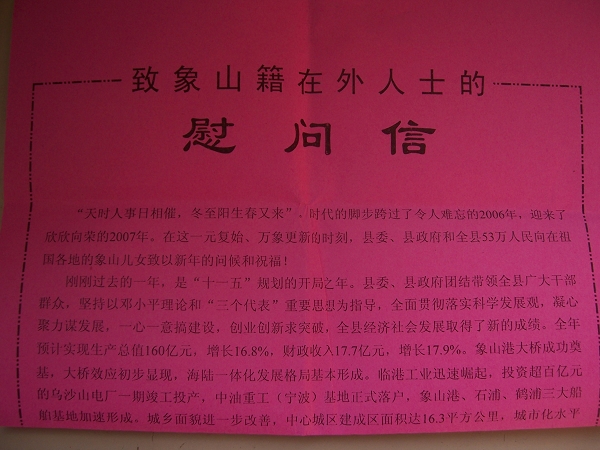 <慰问信>介绍了家乡2006年所取得的巨大成绩\及2007年工作思路.希望大家一如既往地关心\支持家乡的各项建设.