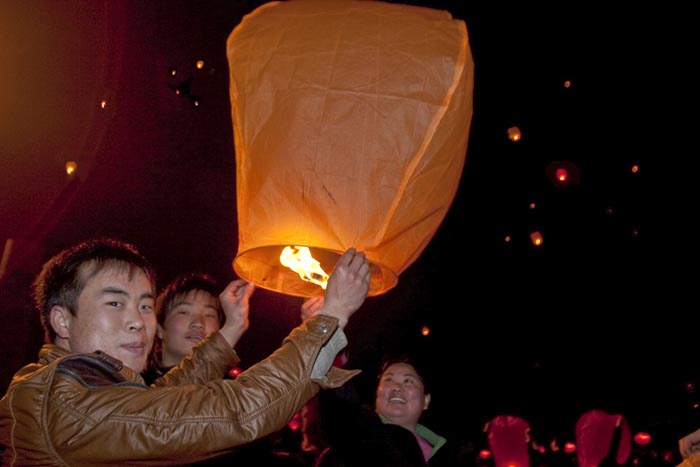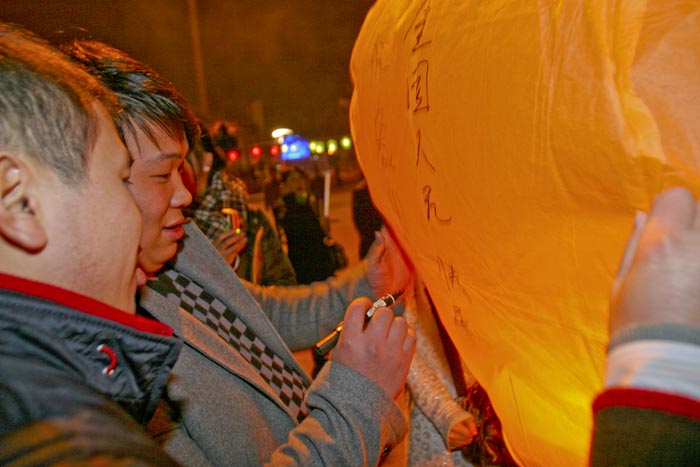 原定晚上6点半进行的放灯,由于风力过大稍作延后。半小时后,中国农业银行象山支行工作人员向市民一一免费派送孔明灯。尽管风力仍然不小,但是市民们还是想尽办法点亮了孔明灯。第一盏孔明灯放飞成功后,人群顿时发出欢呼声。风力忽大忽小,祈愿的灯笼陆陆续续飞向夜空。夜空中点点灯火组成壮观的场面,与广场高挂的大红灯笼遥相呼应。好多市民点燃灯具后急切地在灯罩外写上祈福的话语,“祝全国人民新年快乐吉祥!”、“祝象山人民节日愉快!”等字样醒目地通过灯光显现。一位小伙子还写上:“但愿人们合力拼搏,让全球金融风暴早日远离!”