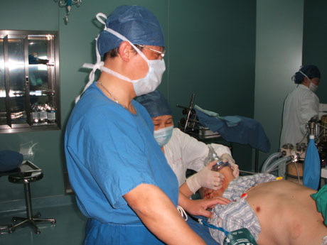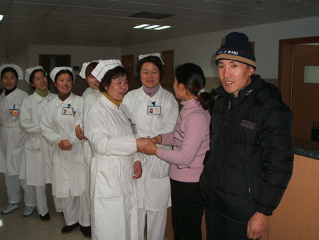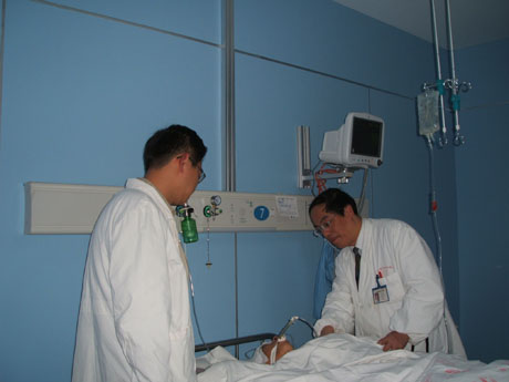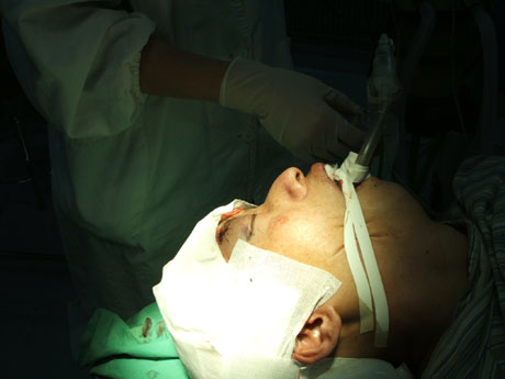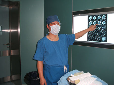 The patient was 24 years old man. When he was working on bend down position at the construction site, a reinforcing steel bar fall down from 12 meters high and the bar penetrated his safe helmet and penetrated from occipital to left frontal head and 1.5 meters long outside his head. The steel bar was 6 meters in length and 12 millimeters in diameter. After the outside part of the bar was cut off, the man was transported to our emergency room in 15 minutes. The blood pressure was 13/9kpa, the heart rate was 90 p/min and the breath rate was 20 t/min. The patient was in an obscure state. The pupils of both sides were dilated in the same size. The light response existed. Weakness of right limb was found in grade III. There were no abnormal signs in the heart and the lung. The deep and superficial reflexes of right limb disappeared and those of the left were kept. The bar went in his head 3cm above the occipital tubercle and 1cm left to the midline. It came out 1cm left to the midline and 2cm above the eyebrow. The wound holes were bleeding. The X-ray of skull indicated that the bar was in the left frontal, parietal and occipital lobe.