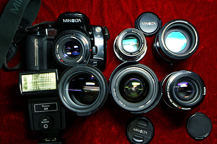 我的相机是美能达的α-5D,机身是2005年买的3850元,现在二手的1500就可以入了.后2张是美能达的第一代百微,2400元二手入的,后来被我2700元出了,去年又重新买了美能达第三代D型全新百微(4000元),是我目前最贵的一个镜头.我目前还有4个手动头,3个自动头.一台数码单反和一台胶片单反.