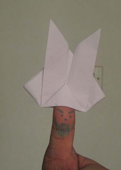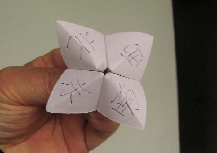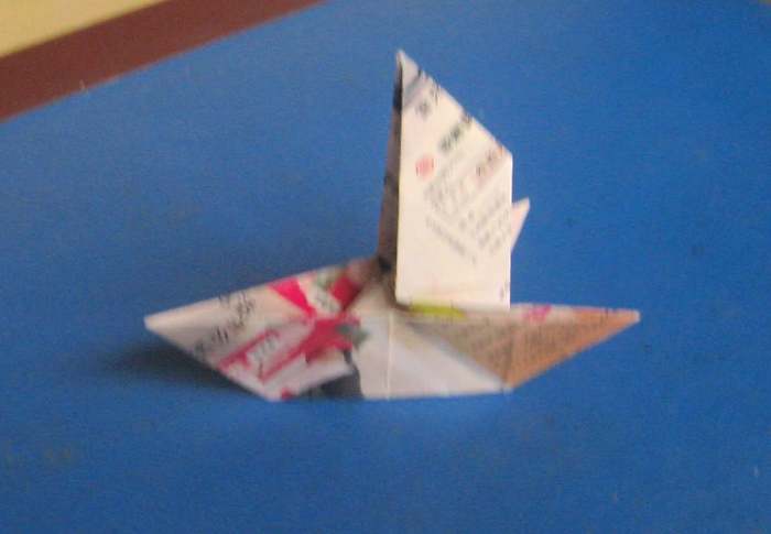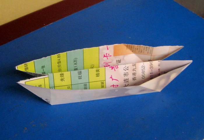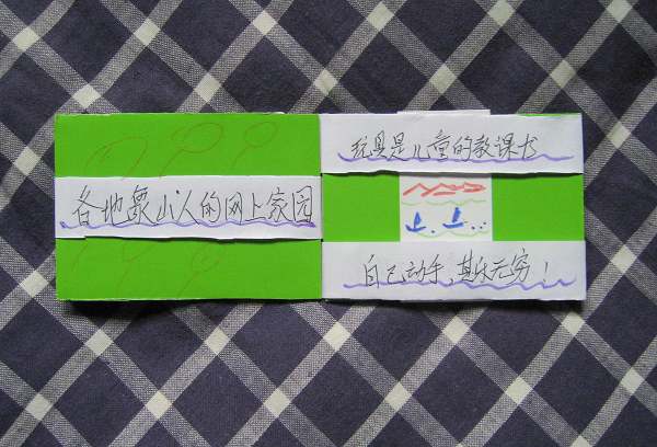 玩法:硬纸板的两边都可以翻动,打开一看:左边一条、右边两条;若将一纸条垂直地放在右边的纸条上,合拢后再从左边打开,那纸条竟然会钻到右边的纸条下面去了。爷爷在三条纸条上写了一些字,合拢后再从左边打开,字竟然也变了(见图3)!