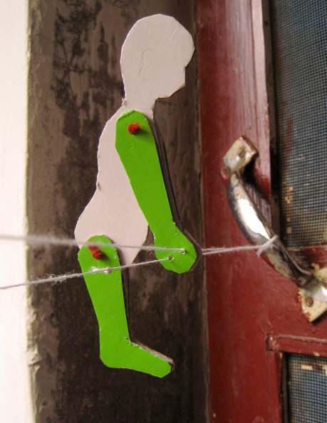 制作:先用硬纸板剪一个运动员的身子与手、脚,将手脚与身体连起来,再在手中打两个孔、穿进一根细线,就做好了。