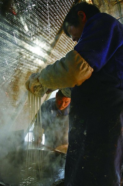 冬面上架并不代表它已经做好了,还要经过晚上零下1℃到2℃的冰冻,早上太阳晒过后才算成功。我们去的那天,正好阳光明媚,撕拽冬面时,伴随着沙沙的声音,碎冰在阳光下洒落,甚是好看,做冬面人满脸的笑容更是灿烂,洋溢着丰收的喜悦。