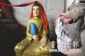 昨日,铜梁县侣俸镇侣俸寺一间紧锁的偏房,供奉着大大小小十多尊菩萨像。最右边的一尊圆雕佛像,高约1米,男儿形象,圆脸,盘着发髻,慈眉善目,右手持树叶状扇子,左手平放,左侧座上有一只长约20厘米的动物凸雕。