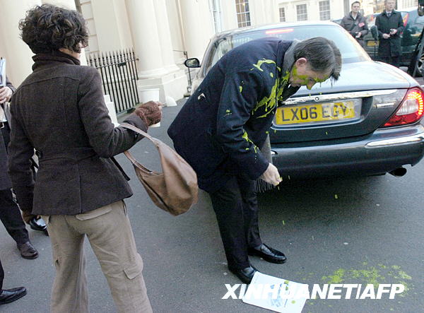 3月6日,在英国伦敦,英国商务大臣曼德尔森遭到一名女性抗议者用绿色奶油蛋羹泼脸。新华社/法新