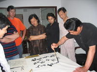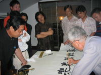 某日,受缨溪诗社副主席吴国华老师的邀请,我们一行十人(象山书法家翁再忠老师,根雕大师张德和老师,书法家孤非老师,天池翠茶业李先平总经理,裱画师周秉雄老师,竹根雕精英王群,陈春荣,象山麦桔画创始人徐敏杰,还有式常与我)欢聚其新居。晚饭后,大家趁着酒兴,舞文弄墨,不亦乐乎。