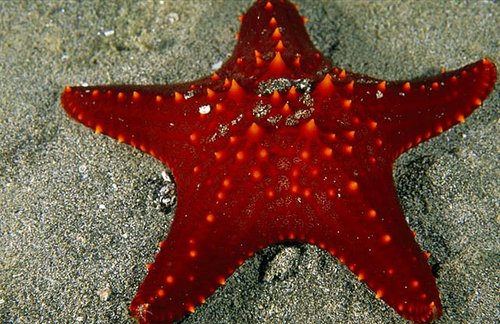 红海星  红海星是加拉帕戈斯海岛海洋生物中漂亮的一景。海星不但可以再生失去的身体部分,而且当受到攻击或者受到伤害的时候,自己会切断肢体来逃生。