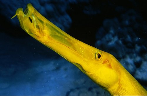 黄色喇叭鱼  在法国波利尼西亚土阿莫土群岛水域,黄色喇叭鱼优雅地游着。它们喜欢把自己跟其它垂直的物体(通常是大鱼)掺和在一起,时常藏在旁边,等待猎物出现接近它,然后就将其捕获。
