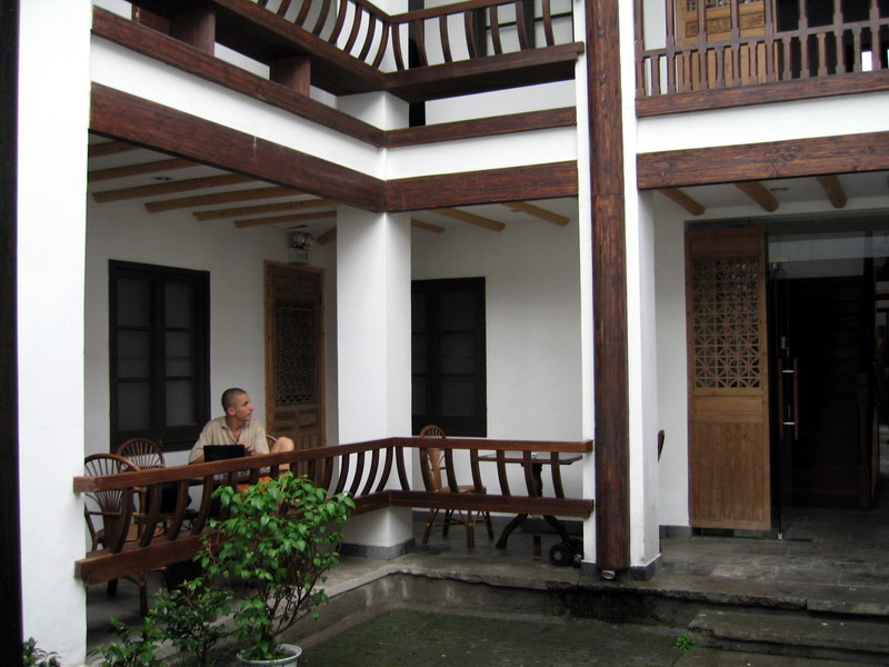 走过一石板小桥,再行数十步,就可见路边一青砖白墙黛瓦的古宅,仿若回到了一个古旧的年代。迎入眼帘的是“湖中居青年旅社”七个字,这是一处由一民居改造成的国际青年旅社,民居是明清时代的风格,墨瓦粉墙,翘檐飞角。错觉中,时光似乎倒退百年。