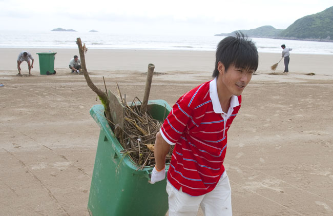 目前,这里大约只有几十位常驻的“岛民”。但是,在每年的5月至10月中旬,这里秀美的风光和自然的生态成为人们体验海岛休闲旅游的好去处。每逢节假日,前来这里的游客成群结队,最多的时候,每天有几千人云集沙滩。随着游客的日益增多,沙滩的污染和卫生成了问题,尤其是潮水带来的大量漂浮物需要及时清理。为了给游客创造良好的旅游环境,驻岛的居民自发组织起了一支沙滩清洁队。他们每天坚持清扫沙滩,清除的漂浮物和游客丢弃的废物达到好几吨。在沙滩上开展清洁活动特别费力,清洁队里有好几位是五六十岁的老人,但是,大家都很卖力。都说:“为了海岛环境,我们应该当好主人公。” |