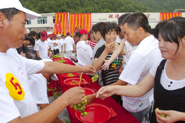上午9点左右,该村的村落文化宫前已经是人山人海。首先登场的是村里的葡萄品种展示与品尝。醉金香、高妻、魏可等17个村里出产的各色葡萄品种呈一字型排开,人们争相品尝。一位邻村的村民惊喜地说:“想不到坦塘村有这么多葡萄新品种。”原先,该村以千亩柑橘为单一产业,八一八台灾后,产业进行了调整,如今,1270多亩的柑橘、葡萄、西瓜等水果香及县内外,1200多亩的对虾、梭子蟹等水产畅销各地。在场的村民们无不为自己的特产自豪,笑声荡漾场内外。
