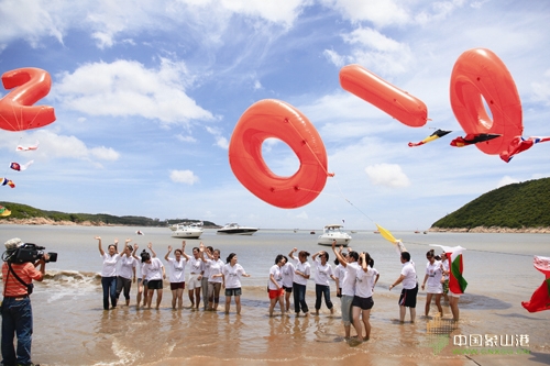 上午八时三十分,活动正式开始。沙滩保龄球、啤酒大赛、烧烤等一系列活动吸引了众多游客的参与。世博吉祥物海宝成了大家的宠儿,游客争相与他合影留念。在活动接近尾声的时候,十几名身穿世博T恤的大学生们将象征着祝福的漂流瓶抛向大海,向海洋、向世界传递着我市人民对于上海世博的美好希冀。4个“2010”的气球带动万国国旗飘扬在晴朗上空的那一刻,现场沸腾起来,掌声、喝彩声连连。