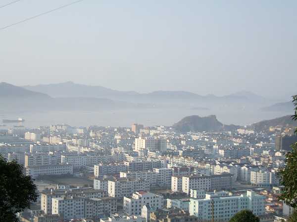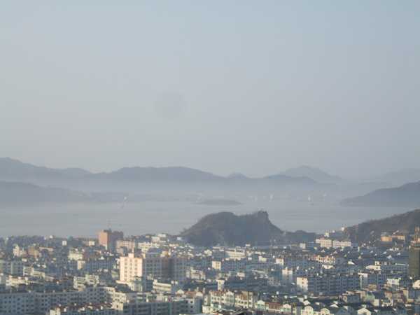 拍摄说明:  正月初五清晨起早登山;到大金山半山腰时太阳初升,向新港区望去----晨曦\海雾\远山\巨轮\人间城郭,十分壮观![吴成根]