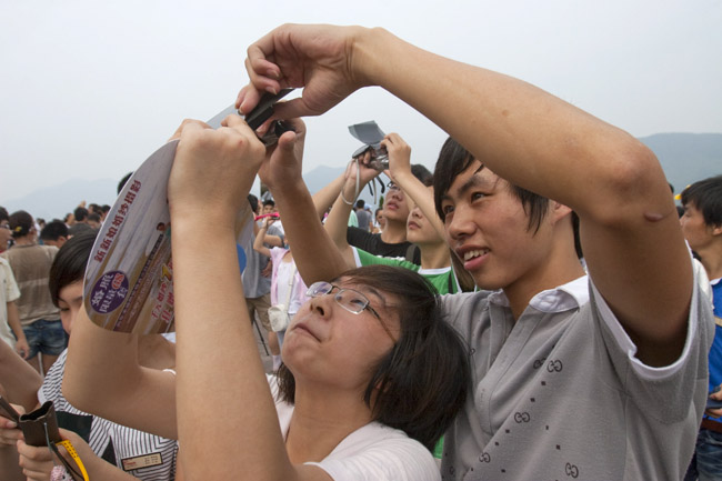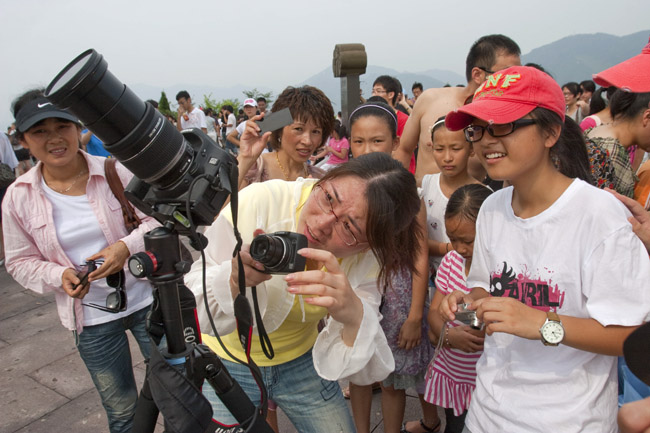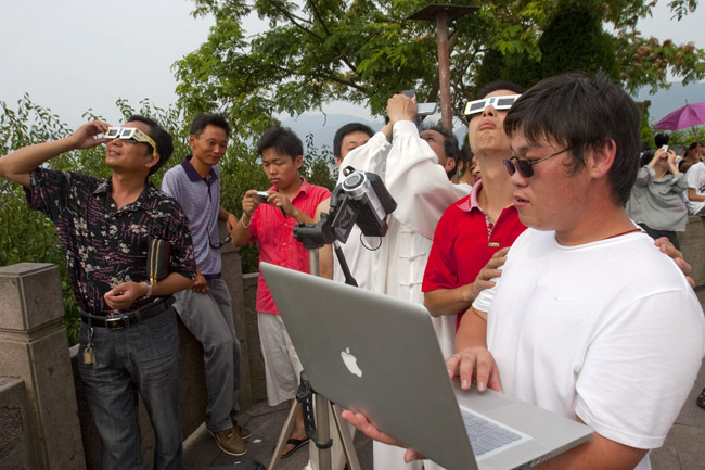 这个不大的平台,可是人满为患,足足有六七百人。人们不但用器材观看日全食的过程,而且有不少人特地选择这个高地用照相机和录像机来拍摄的实况。其中有五六个人来自宁海的“追日族”,特地赶来象山看日全食。他们还带了手提电脑和摄像机,一个领头的说,他们宁海看不到日全食,所以前来“追日”,并且对日全食过程进行进行网上直播。