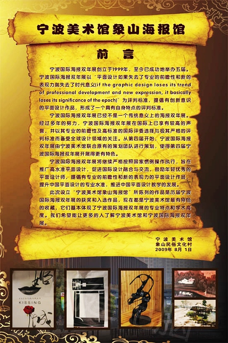 宁波美术馆象山海报馆“落户象山民俗文化村。陈列的作品是历届宁波国际海报双年展的获奖和入选作品,现在都是宁波美术馆最有特色的收藏,它们基本体现了宁波国际海报双年展的专业特点和学术高度。我们希望能让更多的人了解宁波美术馆和宁波国际海报双年展。