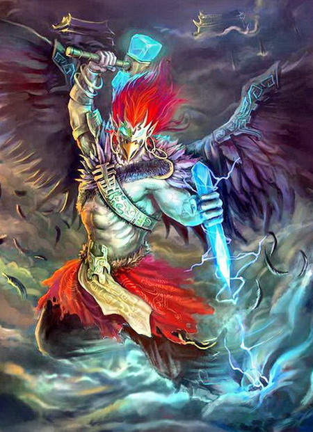 我国雷公信仰起源久远,民间自古崇敬雷公。《山海经》中雷神“龙身而人头,鼓其腹则雷也”,或“状如牛,苍身而无角,一足,……其声如雷”;皆为半人半兽形。东汉王充《论衡•雷虚》“图画之工,图雷之状,累累如连鼓之形。又图一人,若力士之容,谓之雷公。使之左手引连鼓,右手推椎,若击之状”已拟人化,击鼓即为轰雷。能辨人间善恶,代天执法,击杀有罪之人,主持正义。